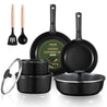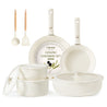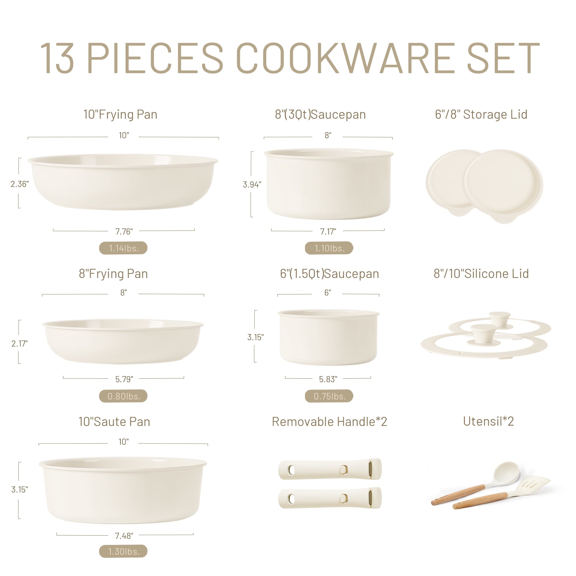 • Ceramic Cookware Set Includes: 8" & 10" Frying Pan, 10" Saute Pan, 6"(1.5QT) & 8"(3QT) Saucepan, 2*Removable Handle, 8" & 10" Silicone Lid, 6" & 8" Storage Lid, Spatula, Ladle.